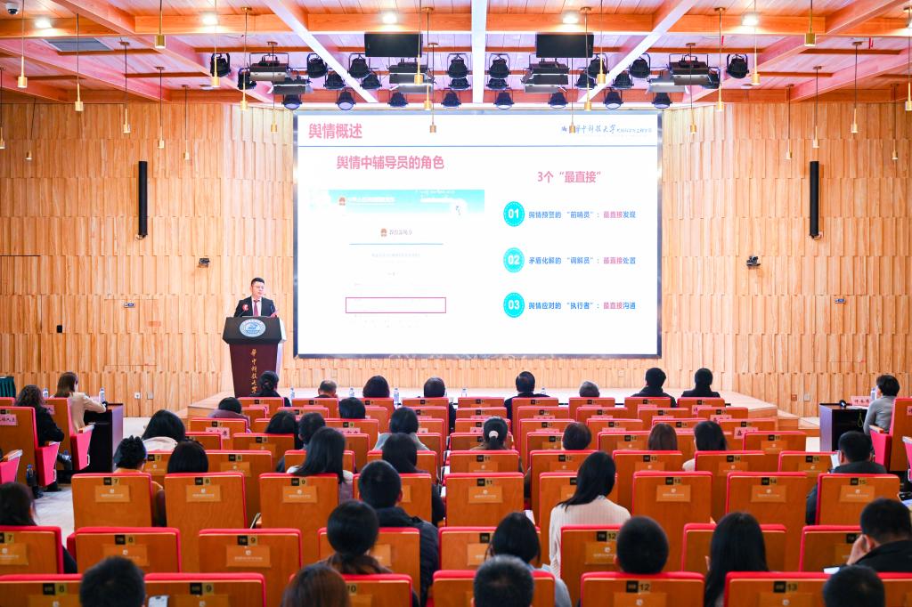 吴毅以《高校员工舆情应对与辅导员专业化职业化思考》为题,从典型舆情案例切入开展舆情成因和传播规律剖析,并提出有效应对措施,在此基础上凝练出辅导员队伍专业化职业化发展路径的思考。