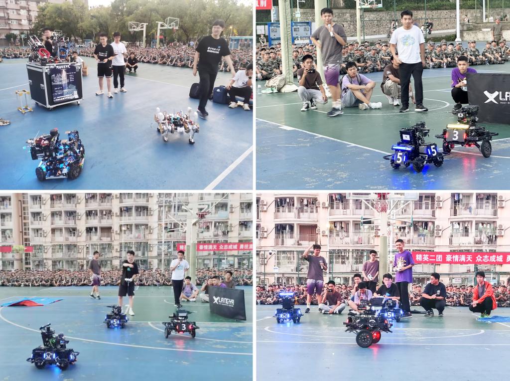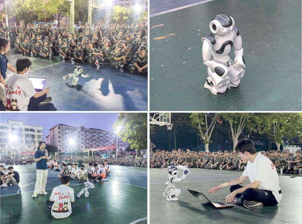 在下午军训之后,全体新生在韵苑篮球场集合,各团队依次与新生分享了科创作品的设计制作过程与团队的获奖经历,并进行现场演示。各团队都展示了自主设计并获奖的机器人作品,Robocon团队的能精准投环和四足步行的赛事机器人,思飞工作室的能实现特技飞行的四旋翼无人机,FOCUS团队的能够通过编程控制跳舞的NAO人形机器人,ROBOMASTER狼牙战队的参加对抗竞技的多种机器人等,它们功能多样,各具特色。新生们被深深吸引,仔细聆听,认真观看。