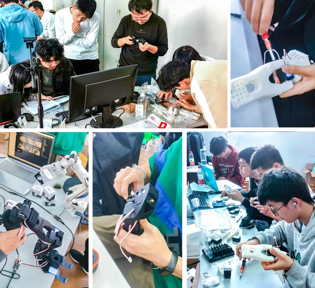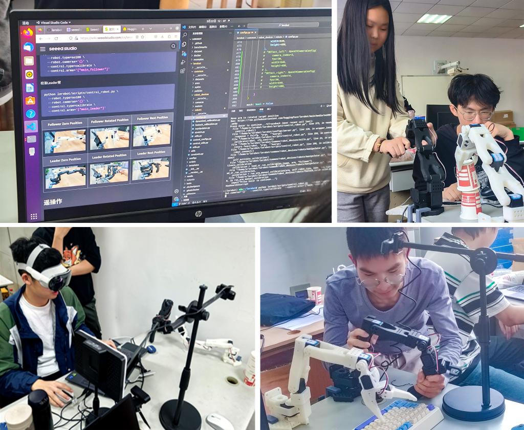 各个队伍从机器人机械结构组装、传感器和电机校准、电路调试等硬件组装搭建到场景选择、功能设计再到开源机器学习框架环境搭建、机器人+视觉数据采集、云端算法训练、边缘设备模型部署与验证评估,全流程体验具身智能机器人应用构建过程。