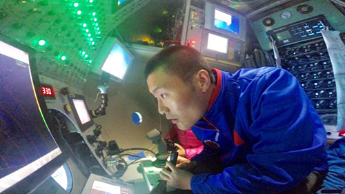 图为实习潜航员杨一帆主驾驶“蛟龙”号成功下潜